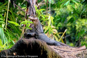 s found along the Venus Drive stream, basking atop the root ball of an uprooted tree; a large Malayan Water Monitor (Varanus salvator). These big reptiles may look intimidating, but are harmless to humans and never attack unless provoked. In order to get a better angle to warm itself in the sunlight, it was hugging a small palm tree tightly.