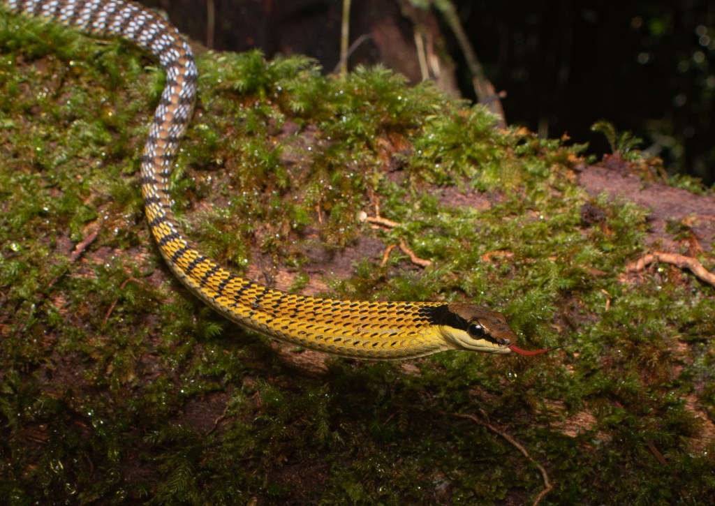 Our first destination was the Frog Pond. This was a 45-minute uphill walk from the accommodations. Stepping onto the boardwalk that surrounded the pond, we were greeted by the calls and eye shines of hundreds of frogs! The species that was by far the most numerous was the Harlequin Flying Frog (Rhacophorus pardalis). There were tens of them scattered around the pond calling to their hearts’ content. As their name would suggest, the extensive webbing on their feet allows these frogs to glide from the treetops in a controlled aerial descent!