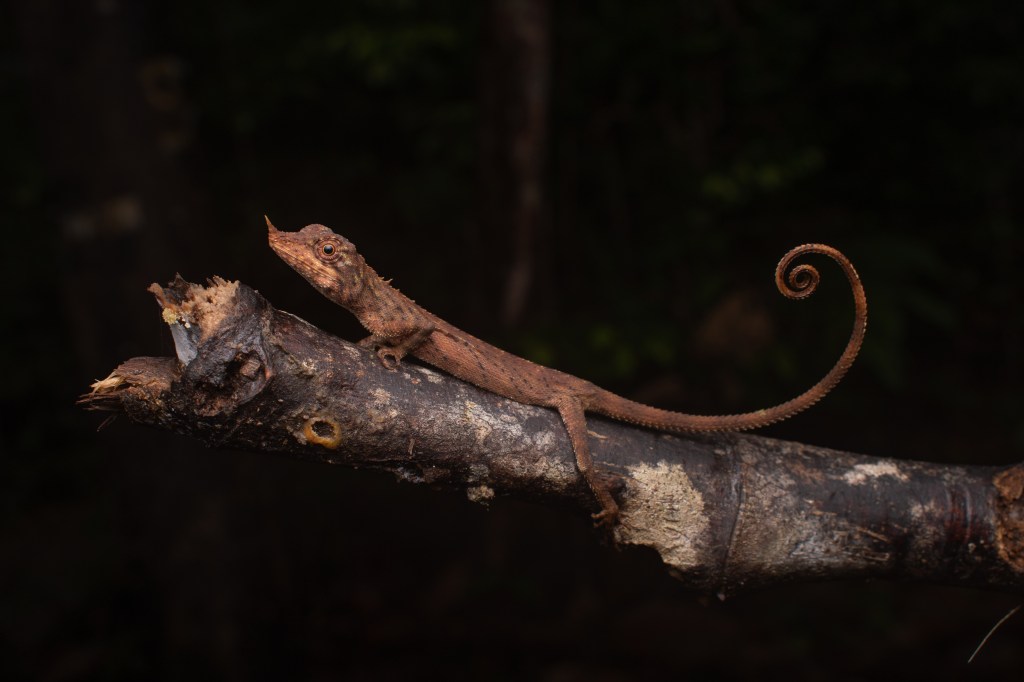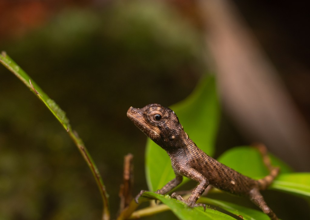 Things took a turn for the worst when we heard thunder and the sky threatened a downpour. We quickly headed to a hut to find shelter. On the way to a hut, Sankar and I simultaneously noticed a slender lizard perched on a branch. We were initially confused, as it did not look like anything we had seen in the guidebook. Closer inspection revealed that it was a female Bornean Horned Lizard (Harpesaurus borneensis)! This is one of the rarest lizards on the island of Borneo!