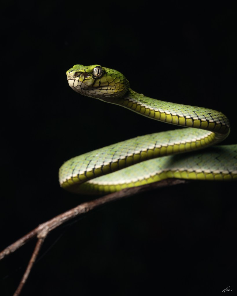 As we headed down the mountain, we stumbled across a juvenile female Sumatran Pit Viper (Trimeresurus sumatranus). We were very cautious when photographing this species as they have potent venom. This particular individual was quite defensive and started striking even as we maintained a safe distance. Due to this, we decided not to photograph it for long and left it alone after a short while.