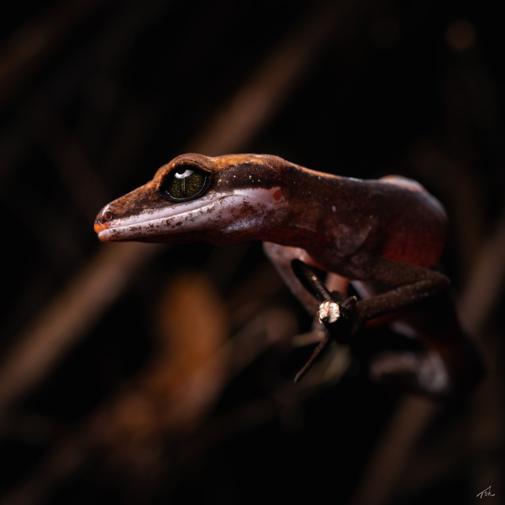 We decided to call it a night and head back to the accommodations. While walking down the hill, Sankar called out in excitement. He had found a rare Fox-faced Gecko (Aeluroscalabotes felinus)! It was a significant find for the trip as none of us had seen that species before. We ended up finding two more individuals in the following nights. We were careful not to disturb them too much as they are known to eject their tails when stressed.