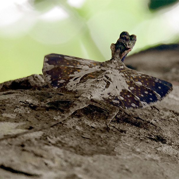 Globally, there are more than 40 extant Draco species. Three of them call our little island (and specifically our trees) home. They are the Sumatran Flying Dragon (D. sumatranus), the Black-bearded Flying Dragon (D. melanopogon) and the Five-banded Flying Dragon (D. quinquefasciatus).