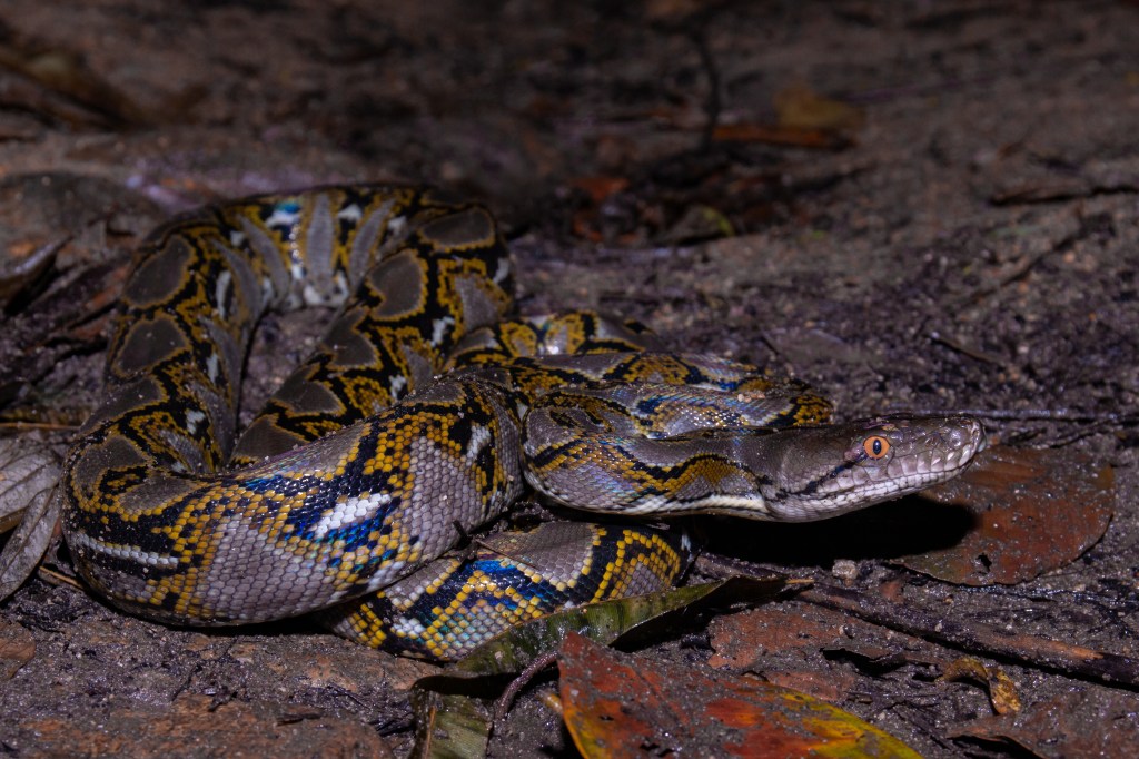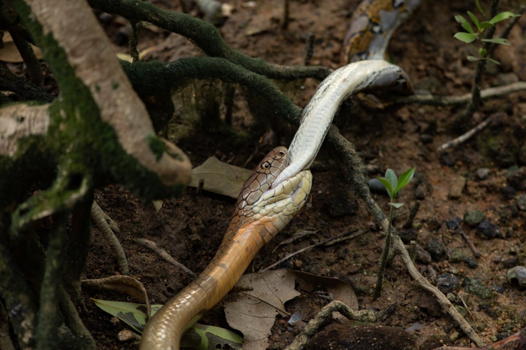 King cobras are the largest species of venomous snake in the world, capable of growing up to 5.7m in length. They predominantly prey on snakes and occasionally on monitor lizards. Reticulated pythons on the other hand, are the world’s longest species of snake, growing up to a staggering 10m in length! This was truly a battle of giants (although these were smaller individuals). We estimated the king cobra was about 2.5m long while the python was only 1.5m long.