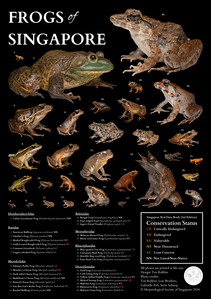 This would not have been possible without the support of HSS President Kannan and Scientific Officer Shiva, whose invaluable feedback guided the poster’s development at every phase. We would also like to thank the Law Brothers and Serin Subaraj for generously providing photographs of some of Singapore’s rarest frogs, for without them, we would not have been able to showcase all 30 species of frogs.