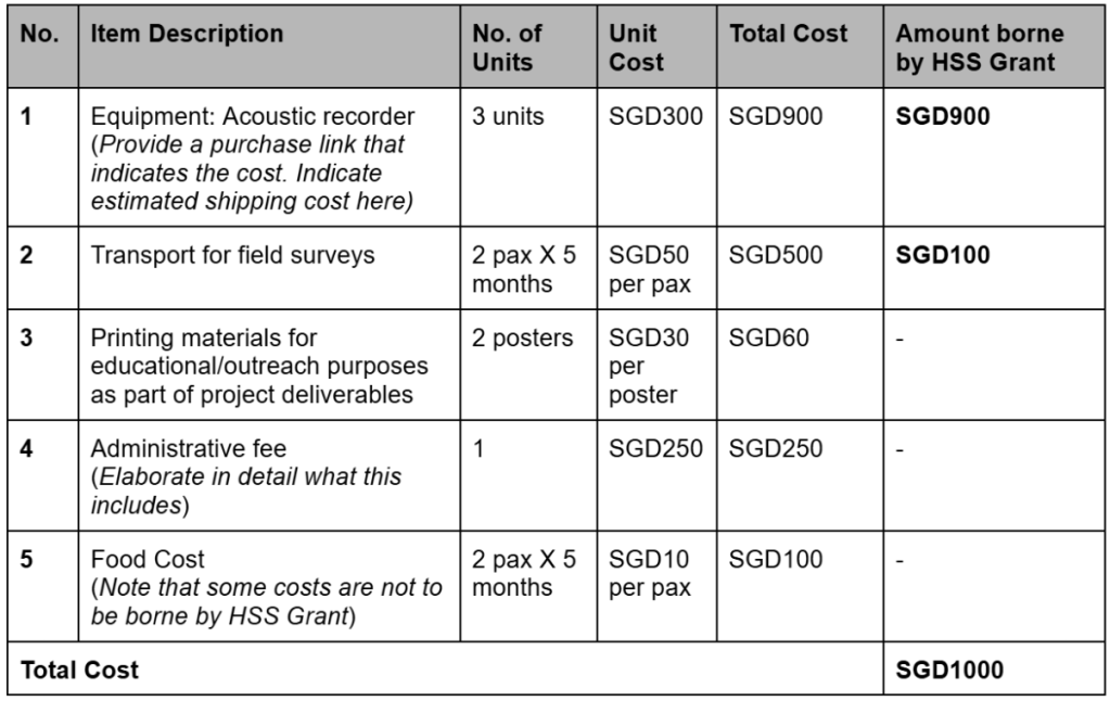 - Be specific about what items are expected to be purchased. Refer to the example below. Note that the overall budget of the study is to be provided, even if HSS Grant Funding is only sought for only a portion of it.
